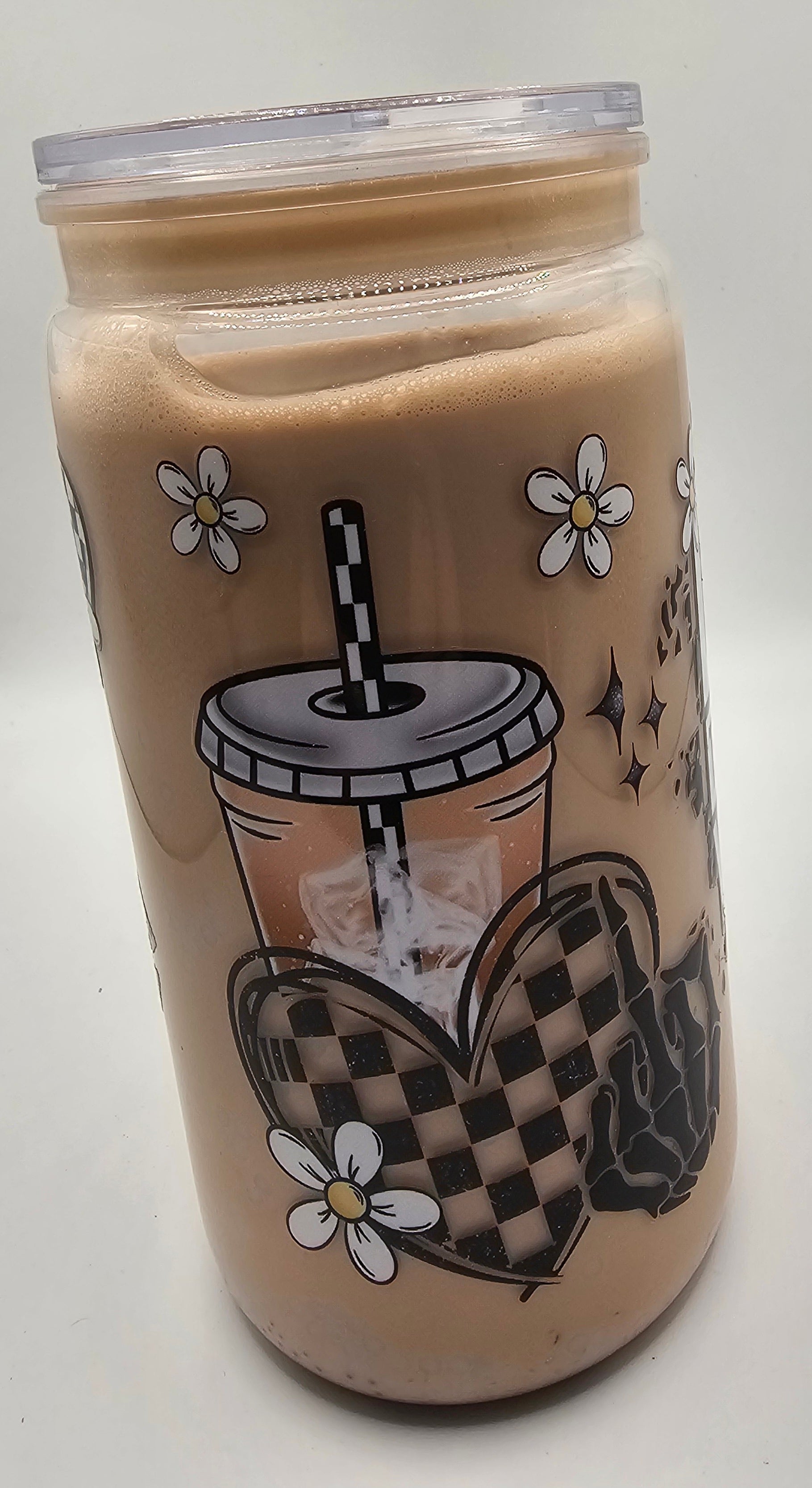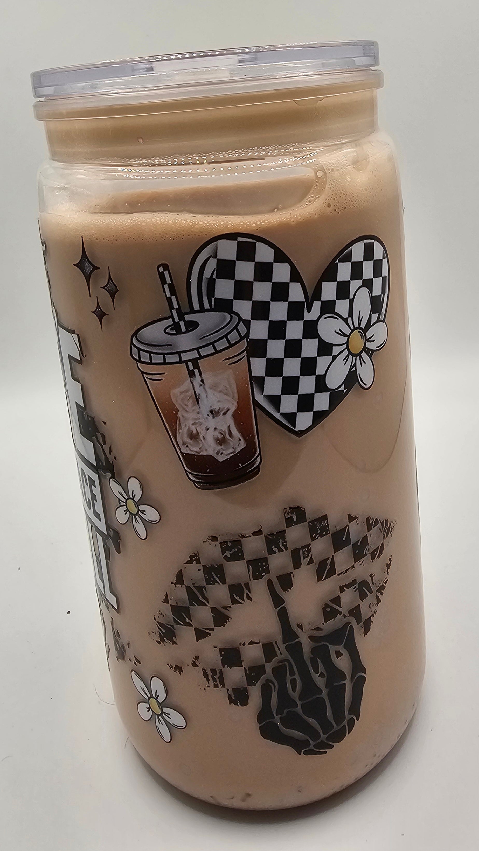 Coffee colored snowglobe. Saying "And yet despite the look on my face you are still talking" fake ice and diamonds inside the snowglobe